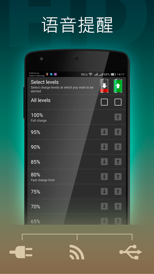 • 通知栏:通过通知栏功能,用户可以实时了解电池剩余电量情况。
